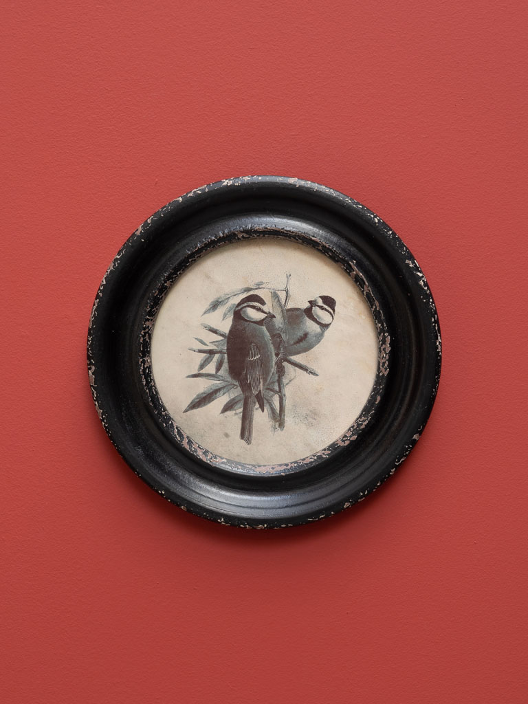 Le Cadre rond MÉSANGES est une véritable fenêtre ouverte sur la faune sauvage, traitée avec une élégance rétro.