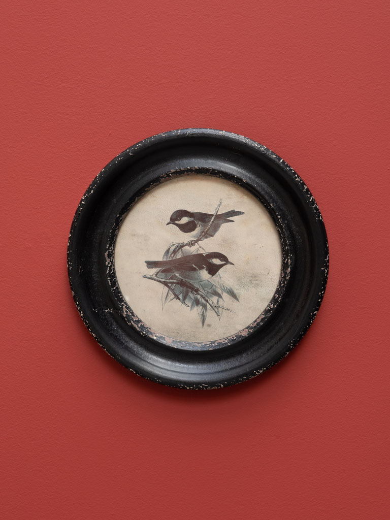 Complétez votre collection naturaliste avec le cadre rond MÉSANGES charbonnières. Ce médaillon mural de 24,5 cm de diamètre présente une illustration raffinée de deux mésanges charbonnières, capturées dans un style gravure d’époque. Son cadre noir patiné aux accents vieillis renforce l’aspect « objet de brocante » et apporte un cachet immédiat à votre décoration. Adoptez ce cadre poétique pour une touche de nature sauvage et élégante.