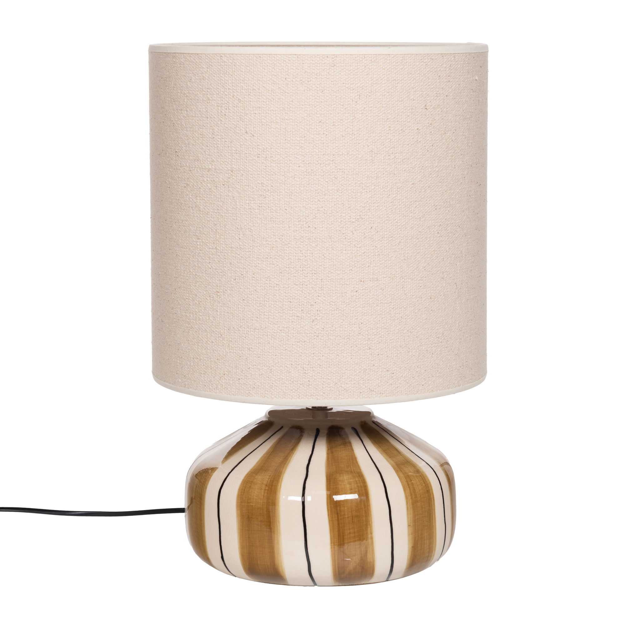 Illuminez votre intérieur avec le design graphique et authentique de la lampe GRACE. Ce luminaire de 54 cm de hauteur se distingue par son socle en céramique vernissée orné de larges rayures verticales marron peintes à la main. Couronnée par un abat-jour cylindrique en coton beige, elle diffuse une lumière douce qui souligne la brillance de son pied artisanal. Adoptez cette pièce de caractère pour apporter du rythme et de la chaleur à votre décoration.